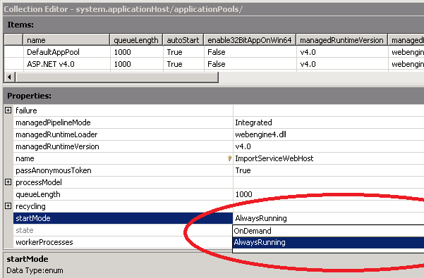 Select the application pool & change the start mode to “AlwaysRunning”. Once you close the popup, make sure you click the Apply button.