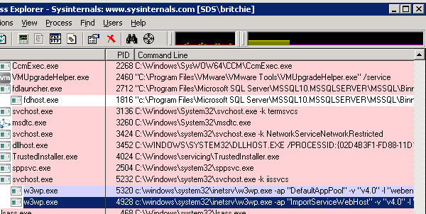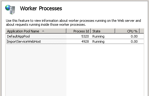 Since all services will be hosted under the w3wp.exe process name, you can see the Worker Process associated with your application pool within the IIS manager: