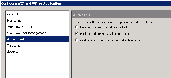 Access the Configure WCF and WF option on the application. Click on the Auto-Start tab & select “Enabled”.