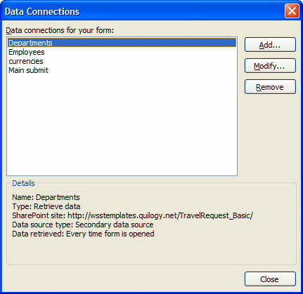 So we see Departments, Employees, currencies, and Main submit. The first three are lookups and Main submit is for sending the form back to SharePoint (the Submit to SharePoint button on the form). Select Departments and click Modify. This brings up the dialog to change the settings for this connection: