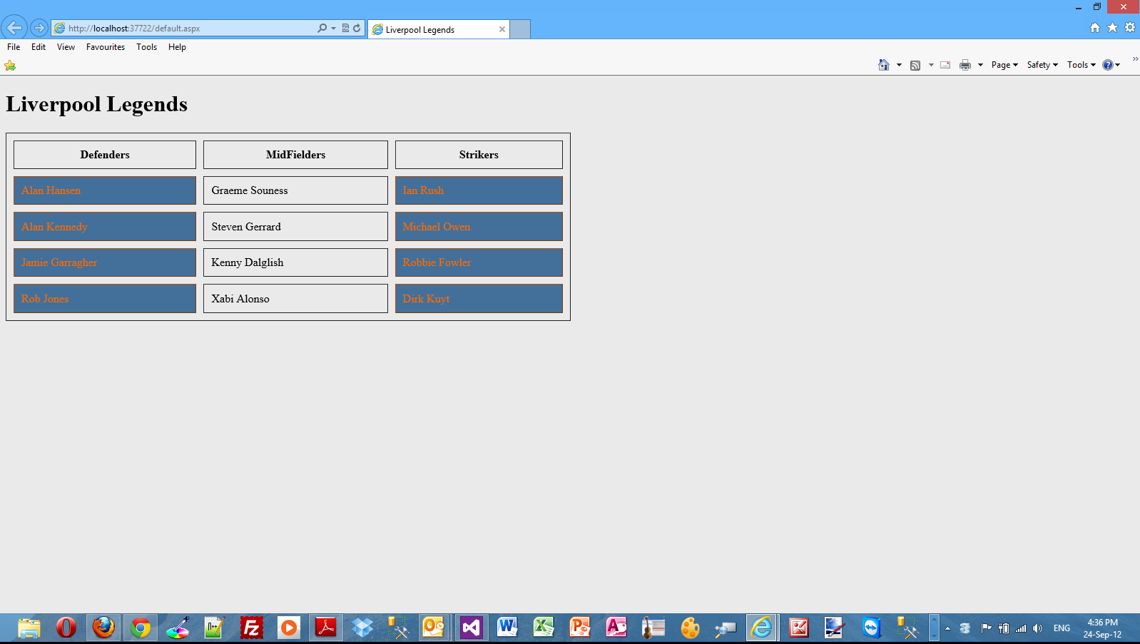 <tr><th>Defenders</th><th>MidFielders</th><th>Strikers</th></tr>