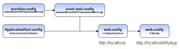 | ASP.NET application root directory | Web.config | The Web.config file for a specific ASP.NET application is located in the root directory of the application and contains settings that apply to the Web application and inherit downward through all of the subdirectories in its branch. |